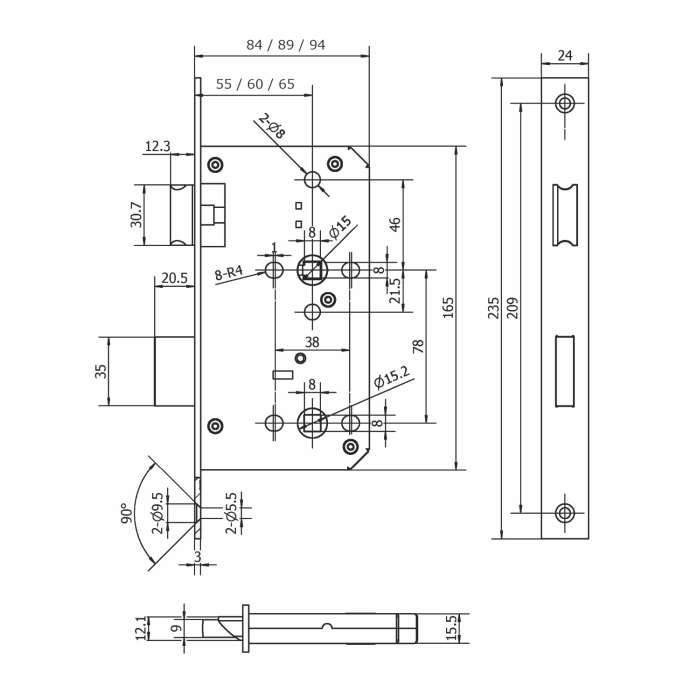 - 55/60/65mm backset, 78mm centres.