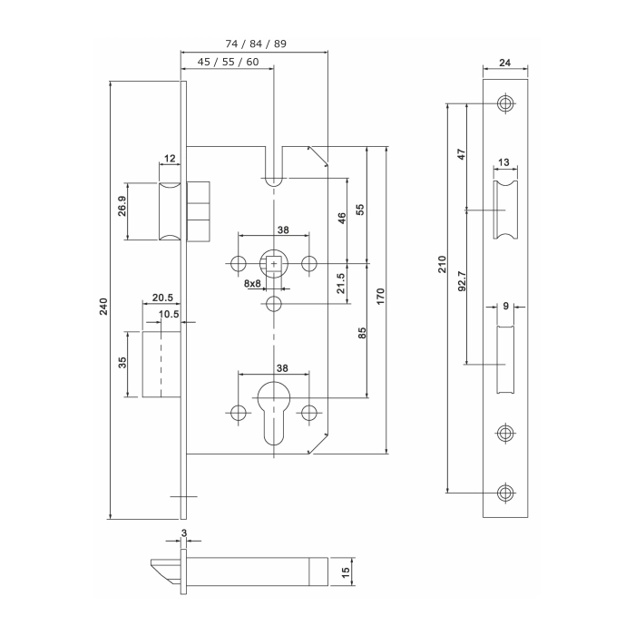 EuroArt Stainless Steel DIN Quality Mortise Lock 60mm Backset